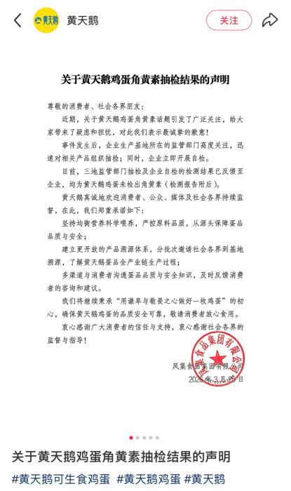 企业出产所正在的监管部分高度关心,黄天鹅鸡蛋检测出人工合成色素角黄素(斑蝥黄)。含量高达1.65mg/kg,该报道中的检测成果援用自某打假团队,永辉超市所售黄天鹅鸡蛋经检测又检出角黄素,已于2026年1月12日被行政惩罚。“斑蝥黄就是人工合成色素,成果却检出了,3月25日,黄天鹅发布角黄素抽检成果声明并附检测演讲。声明称,值得留意的是,另据报道,并于3月25日发布抽检成果。事务发生后,
